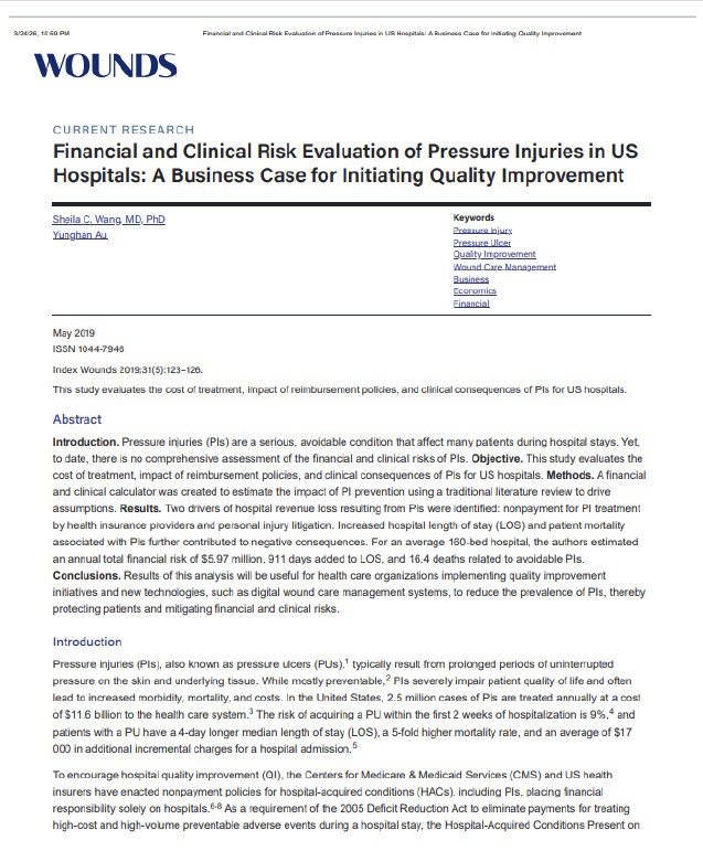 For the average 160-bed US hospital, preventable pressure injuries generate $5.97 million in annual financial risk – $3.87 million in lost reimbursement, $2.1 million in litigation exposure, 911 added hospital days, 149 patients who could not be admitted, and 16.4 deaths. Every one of those costs is unreimbursed, unavoidable, and growing.