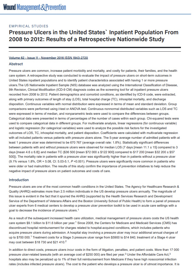 Among 676,435 hospitalized patients with pressure ulcers, median length of stay was 7 days versus 3 days for those without – more than double. Hospital stays involving a pressure ulcer may incur additional annual charges of up to $700,000. Patients with PIs were significantly more likely to have longer stays, higher charges, and worse outcomes across every measured variable.